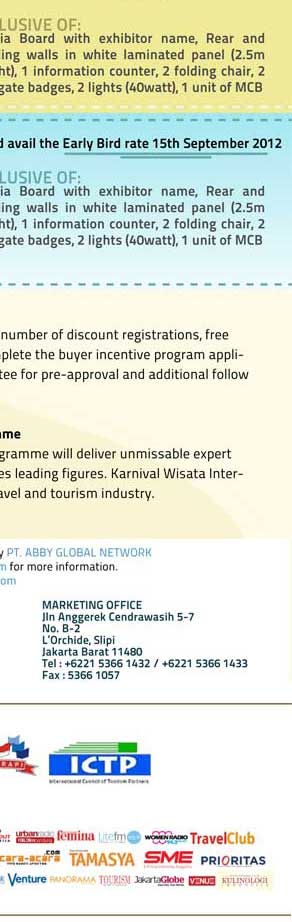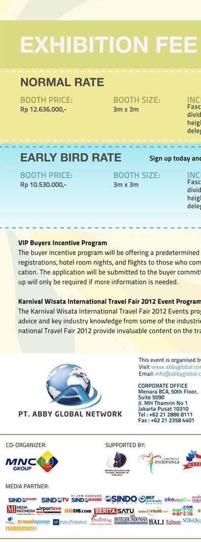 PT Abby Global Network is a fast-growing event and exhibition company. We are the organiser of KARNIVAL WISATA INTERNATIONAL TOURISM FAIR 2012, set to be the most exciting tourism expo event in Indonesia. We are looking for motivated and dynamic persons to join our team